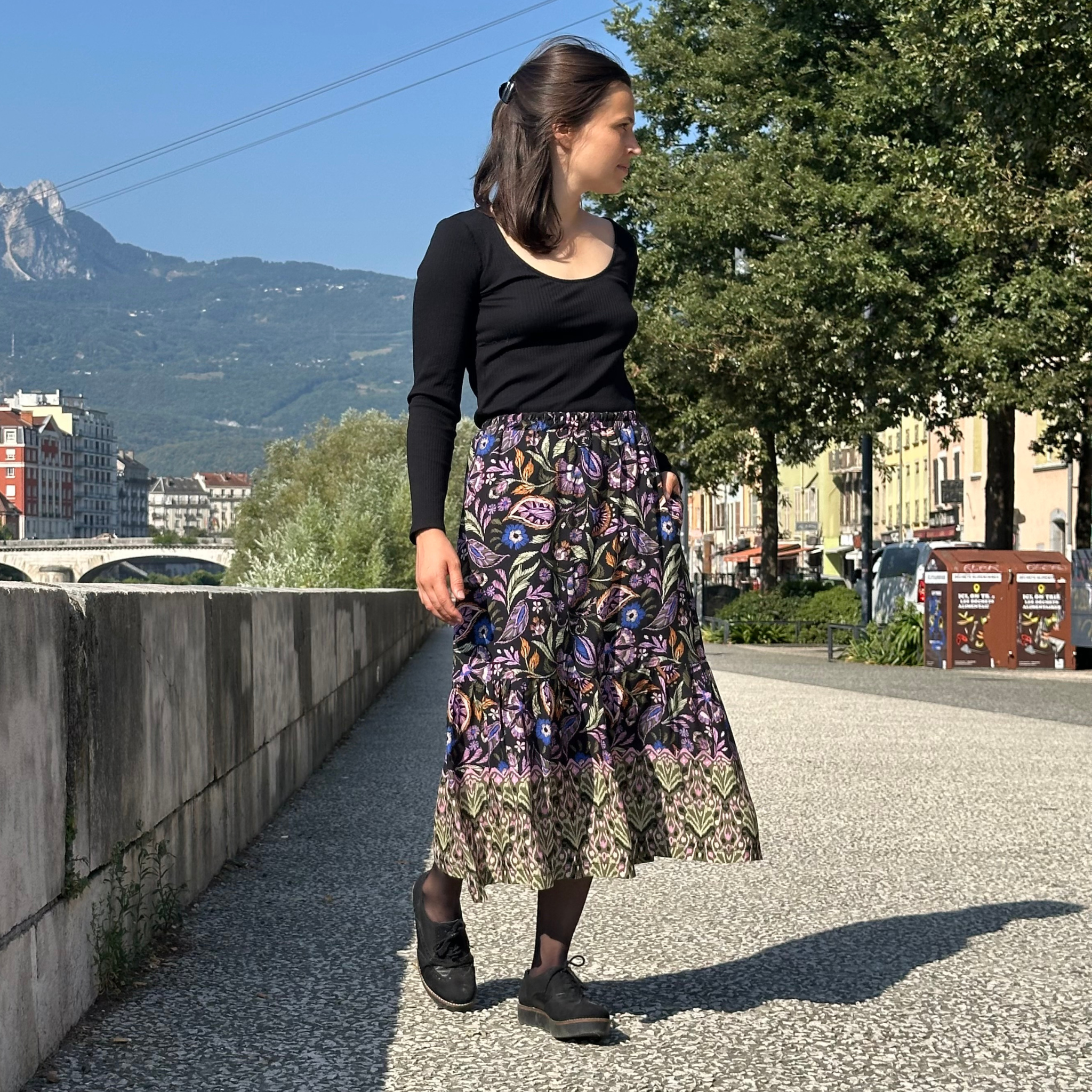 Coupe : La jupe bohème est élastiquée à la taille. Elle dispose de deux poches cousues dans les coutures de côté. Elle est faite de deux parties dont une froncée sur le bas, ce qui offre du volume. Cette jupe est à porter taille haute ou taille basse selon vos envies !